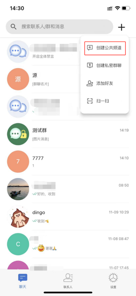 用户可点击顶部栏的【+】按钮,选择创建公共频道选项发起公共频道群聊。可在群聊会话窗口发送文字、图片、语音消息、短视频、文件、表情等消息。